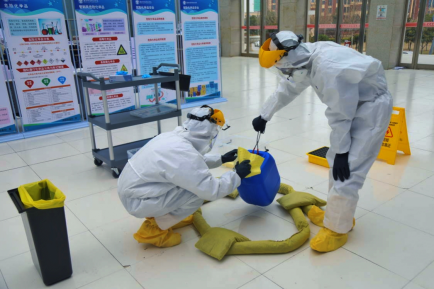 危化品泄露应急演练以人员在试验中因不规范操作导致危化品泄漏为应急模拟场景。事故发生后,人员第一时间进行事故上报,组织实验室内人员有序撤离。应急救援人员做好安全防护,对泄露品进行处理,消除危险源,最终恢复现场。整个演练过程,有步骤、有秩序地执行了完整的应急处置方案,达到了演练预期的目的和效果。