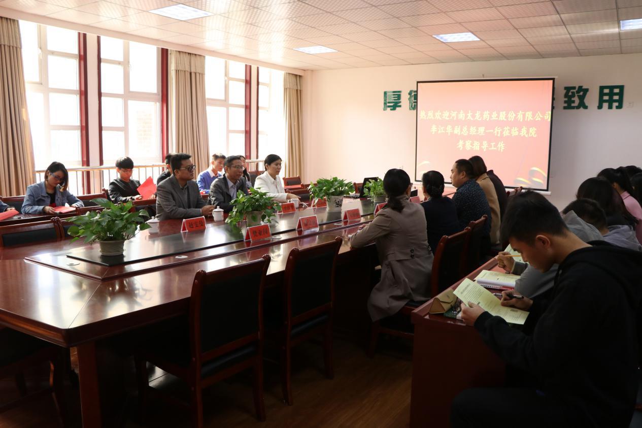 (文/李旸 图/樊亚闯)2017年10月24日上午,河南太龙药业股份有限公司副总经理李江华先生应邀来公司进行校企合作考察、商谈,企业人事部胡艳凤总监、销售部刘亚辉总监和人事专员赵雯曼随行。经理宋丽丽教授、公司党总支书记高积学、副经理张会丽及公司教务、科研、校外实践教学、员工就业等方面工作的负责人参加了会谈。