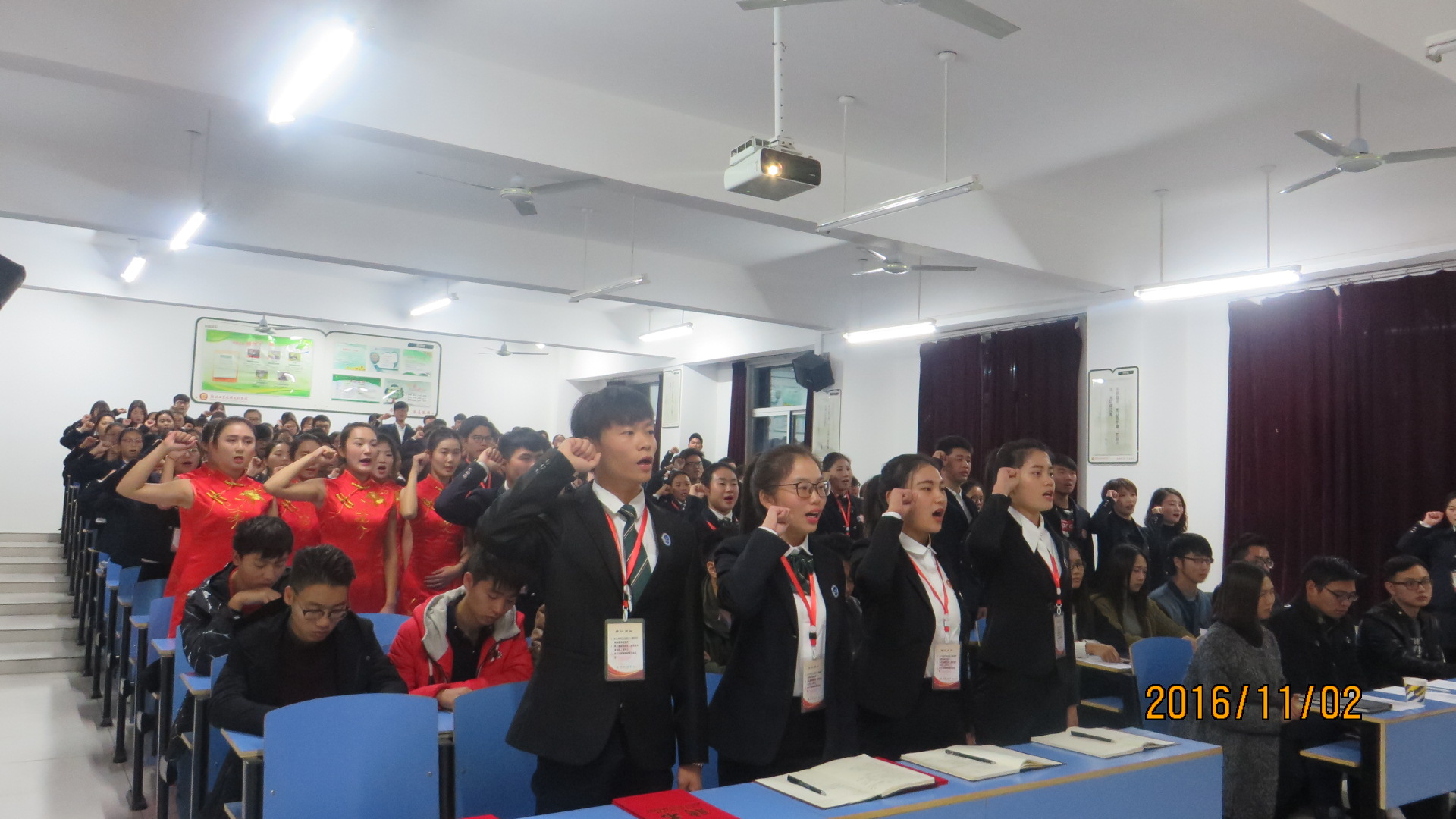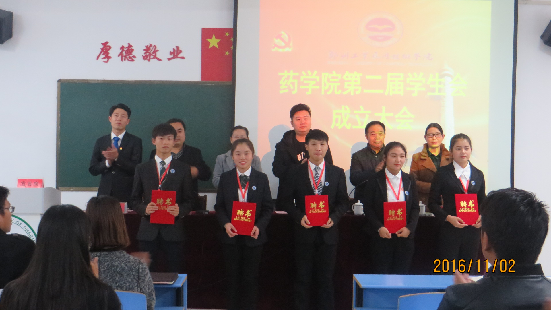 11月2日晚上18点,药公司第二届员工会成立大会在信科2-105教室召开。出席本次会议的领导有校团委书记赵飞、药公司经理宋丽丽教授、药公司党总支高积学书记、药公司副经理谢新年教授、药公司张会丽副经理,校员工会主席司少龙同学,以及药公司全体辅导员老师等。
