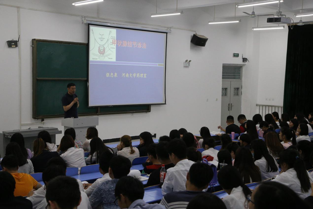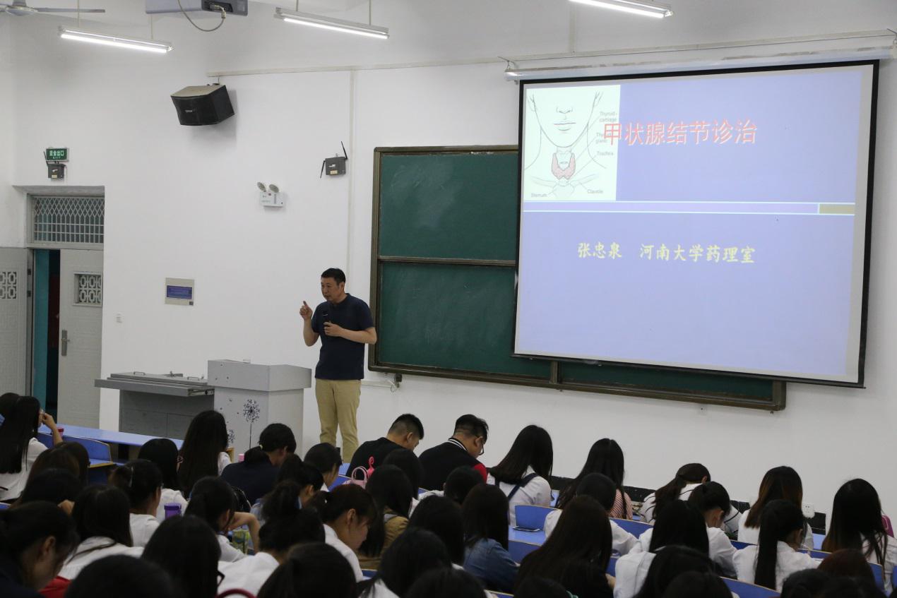 5月26日,张忠泉教授于xk3-阶五举办甲状腺结节诊治进展学术报告会,为药公司广大师生介绍了甲状腺结节的作用、分类、患病因素和诊断等。首先,张忠泉教授向药公司广大师生介绍了甲状腺具有维持人类身体的基础代谢和维持人体的生长发育这两大作用,甲状腺的缺失,容易造成焦躁不安,心率降低,呆小病等。接着张教授开始介绍甲状腺结节的诊断,指出《甲状腺结节指南》的推荐,分为两种情况,而基于专家的意见分为强烈推荐和反对推荐,说明目前存在医患矛盾,张教授提出甲状腺结节的病因及分类,患病率以老年人和女性为主,甲状腺结节评估的要点是良恶性的鉴别,九种危险因素,实验室检查结果,超声检查在甲状腺结节评估中的作用,甲状腺和竖线,在甲状腺核素显像结节评估中的作用和妊娠妇女甲状腺结节的处理等16个问题。