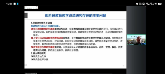 2022年12月15日(星期四)下午15:00-16:30,beats365唯一官方网站组织全体教职工参加“从问题到课题—教学研究项目选题与实施”专题培训,其中全体新教师及其他专职教师(有上课安排的除外)共计30余人通过学习通APP参加了本次培训。