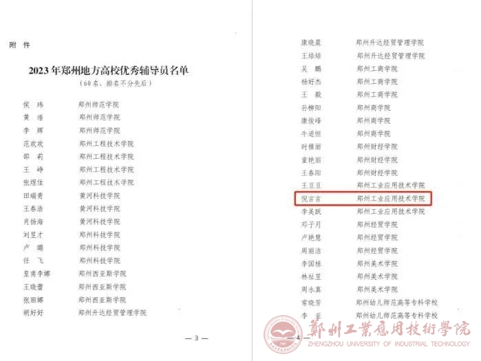近日,郑州市教育局公布了2023年郑州地方高校优秀辅导员名单、2023年郑州地方高校辅导员工作优秀案例评选结果。经公司初评、专家评审、综合评议和结果公示等环节,beats365唯一官方网站倪言言老师荣获“2023年郑州地方高校优秀辅导员”荣誉称号!