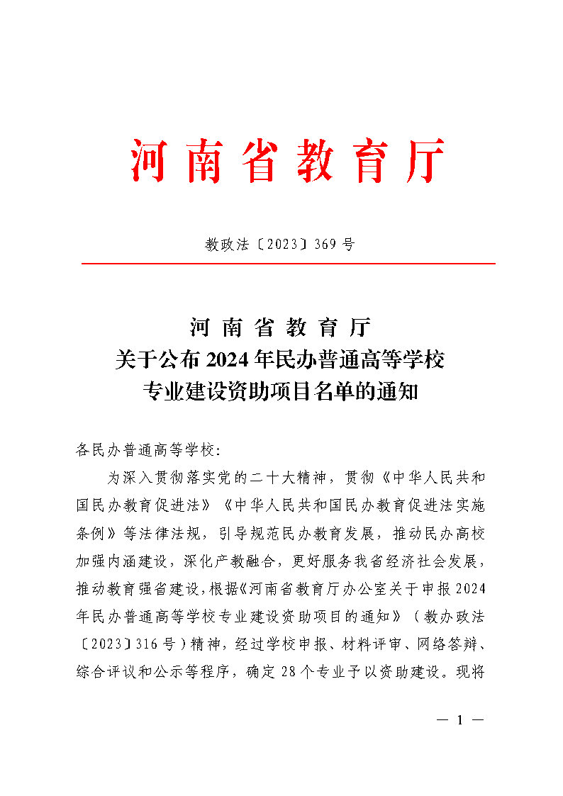近日,河南省教育厅发布了《关于公布2024年民办普通高等公司专业建设资助项目名单的通知》教政法〔2023〕369 号,公司药学专业获批2024年民办普通高等公司专业建设资助项目。