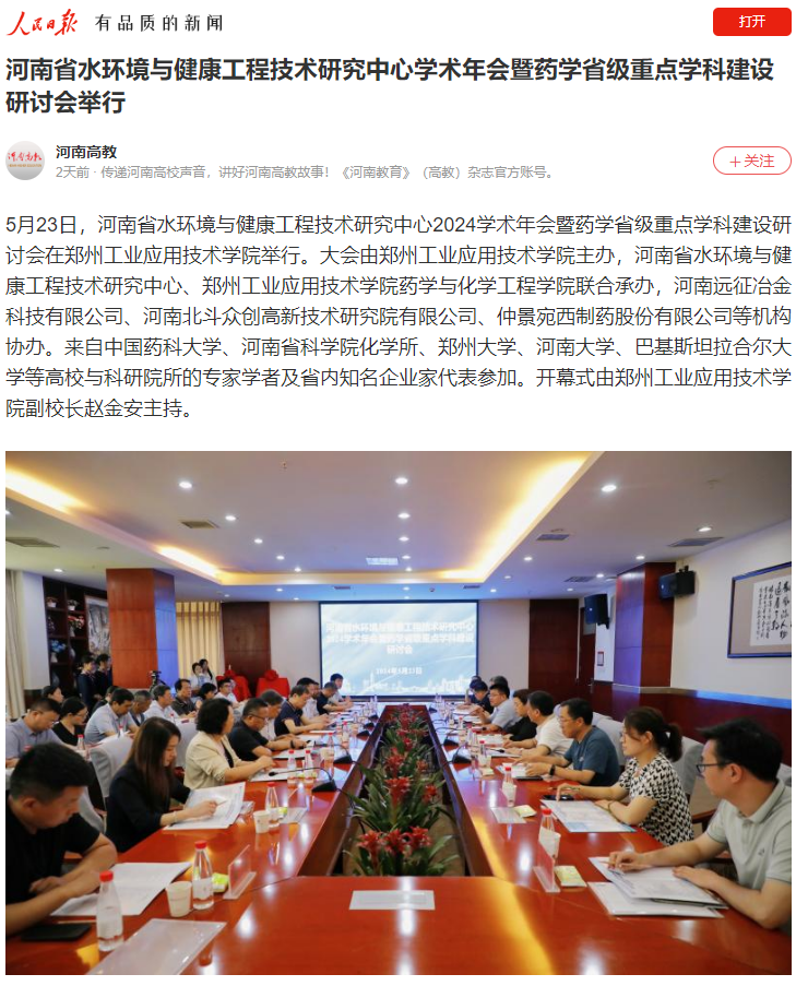 文章原文:河南省水环境与健康工程技术研究中心学术年会暨药学省级重点团队建设研讨会举行 (peopleapp.com)