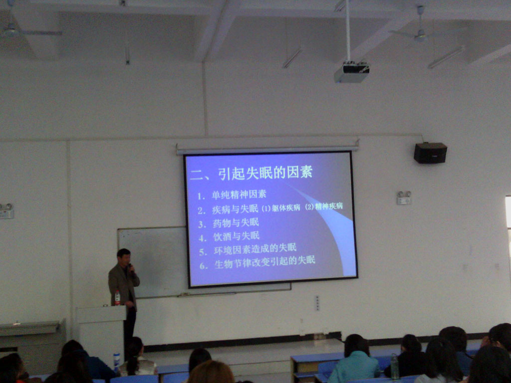 讲座开始,张教授以一组反映现代生活节奏和生活压力的有趣图片导入讲座主题,并阐述了由失眠所引发的一系列疾病,充分引起在座同学的浓厚兴趣。讲座的主要内容有:第一部分:什么是健康睡眠;第二部分:失眠病症及其治疗原则和方法。张教授以幽默诙谐的语言给同学们讲解了失眠给人类健康所带来的不良后果及如何如何诊断失眠病症,将抽象的神经药理理论讲解得深入浅出。在座的同学们对张教授的精彩讲解频频给以热烈的掌声。