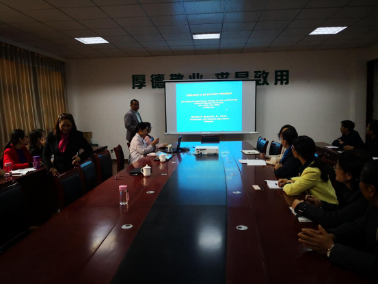 首先,关逊博士用纯正的英文介绍了菲律宾中央大公司园环境及他本人的科研工作室,从该校员工培养情况、教师指导员工做科学研究、研究的领域等多个方面进行了较为详细的讲解,公司教师均表示受益匪浅。
