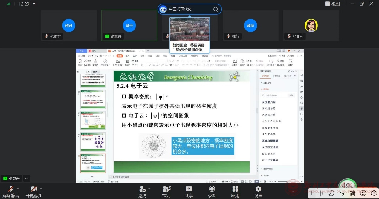 首先是化学化工教研室相关青年教师马杰祎进行主讲,主要讲解生物质资源相关的内容,主讲图片如图1所示;主讲结束由个评委老师进行评价;接着是化学化工教研室相关青年教师安亚丹进行主讲,主要讲抗内压圆筒封头相关的内容,主讲图片如图2所示;主讲结束由个评委老师进行评价;接着是化学化工教研室相关青年教师魏荷进行主讲,主要讲难溶电解质的溶解平衡相关的内容;最后是化学与化工教研室教师张慧丹进行主讲,主要讲电子云相关的内容。
