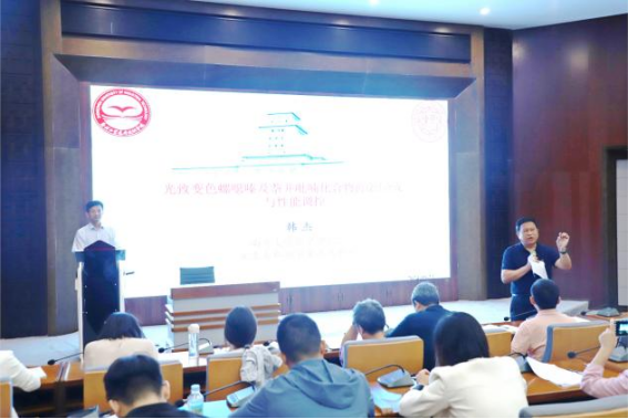韩教授分享了其团队的最新科研成果,首先介绍了光致变色螺噁嗪在温和条件下的固态研究,此项研究制备出了具有优异性能的螺噁嗪化合物,发现了取代基的空间位阻对光响应速度的重要影响,在光致变色材料的实际应用中提供了重要的基础。其次分享了团队的另一项成果,萘并吡喃超分子聚合物的构筑与光致变色性质调控,从构建的超分子聚合物光致变色材料角度出发,为开发新型光致变色材料提供了新的思路和方向。韩杰教授以严谨而不失幽默的方式圆满完成了学术报告,一百多名师生受益匪浅。而且,韩教授鼓励和欢迎在座的员工报考南开大学的硕士研究生,并详细给同学们讲解了南开大学硕士研究生报考的情况。最后,与会师生积极与韩教授互动交流,现场气氛活泼,交流充分,反响热烈。