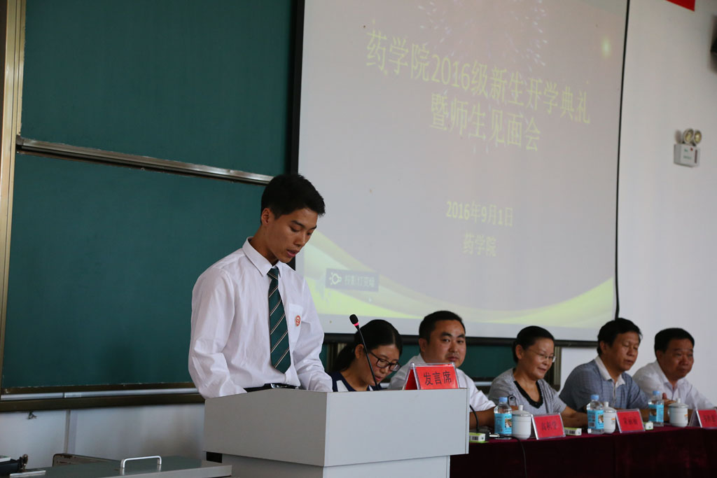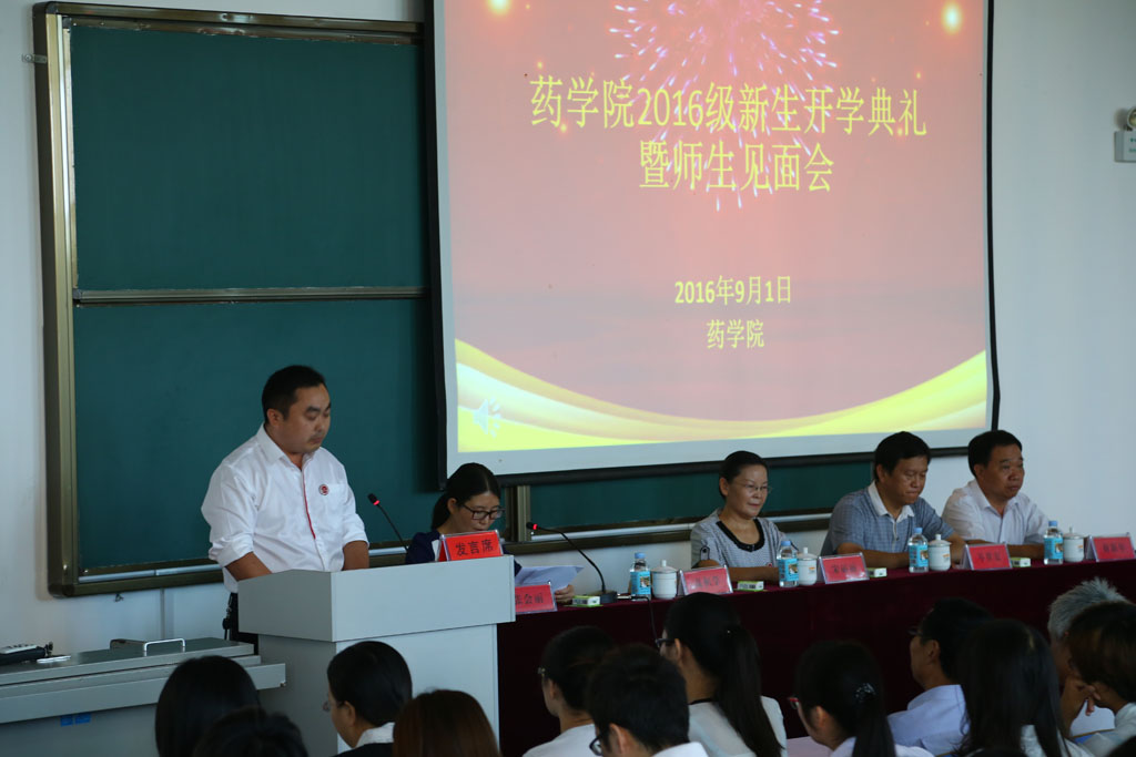 公司党总支书记高积学在开学典礼上致辞,他代表药公司全体师生向2016级新同学表示最热烈的欢迎和最美好的祝愿!他对同学提出了五点希望:仰望星空,脚踏实地;珍惜时间,活在当下;感恩于怀,付之以行;尊重传统,思变创新;不忘初心,志存高远。希望同学们充分利用药公司提供的优良学习环境,陶冶理想情操,学会自主学习,强化自我管理,刻苦钻研,增长才干,使自己早日成为深受社会欢迎、具有扎实专业基础的高素质应用型人才。