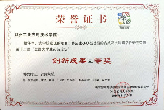 公司李浩、刘娟、王梦娇、吕志远组成的员工团队,在指导教师翟广玉教授、冯亚莉老师的带领下,荣获第十二届“全国老员工药苑论坛”创新成果奖三等奖。