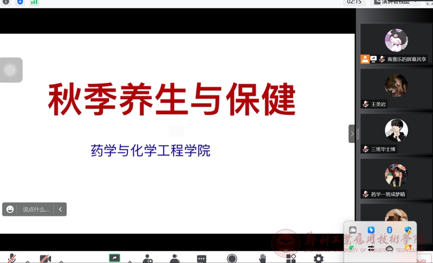 本次宣讲由药学专业员工代表王美岩、黄赛乐主讲,主讲人结合起居养生、饮食养生、精神养生和运动养生等方面为新生讲解了秋季养生的特点。此外,还讲述了预防秋季疾病和养生保健的重要性和必要性,将专业知识转化成了简单易懂的健康指南。