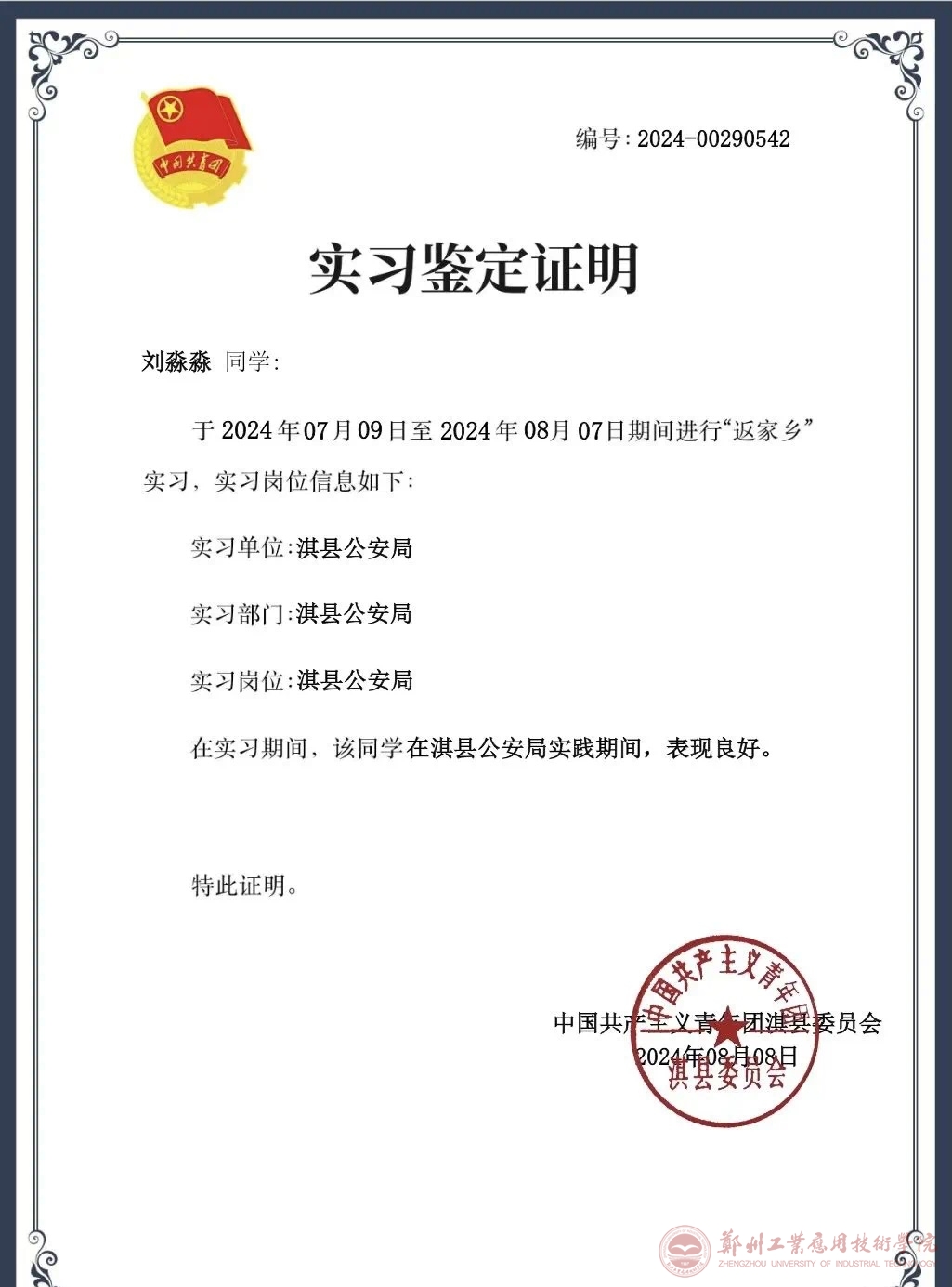 8月7日上午十点左右,托管班正式结课。经过一个月的实践,刘淼淼同学受到了淇县共青团委员会的表彰以及淇县公安局的表扬。“烈火炼真金,实践检验真理。”这次实践活动不仅增强了她的自信心,还让她有机会体会孩子们的内心世界。刘淼淼同学表示,在未来,她会继续努力学习,参加更多的实践活动,培养自己的实践能力,提高自己的责任心与奉献精神,为未来的发展打下坚实的基础。