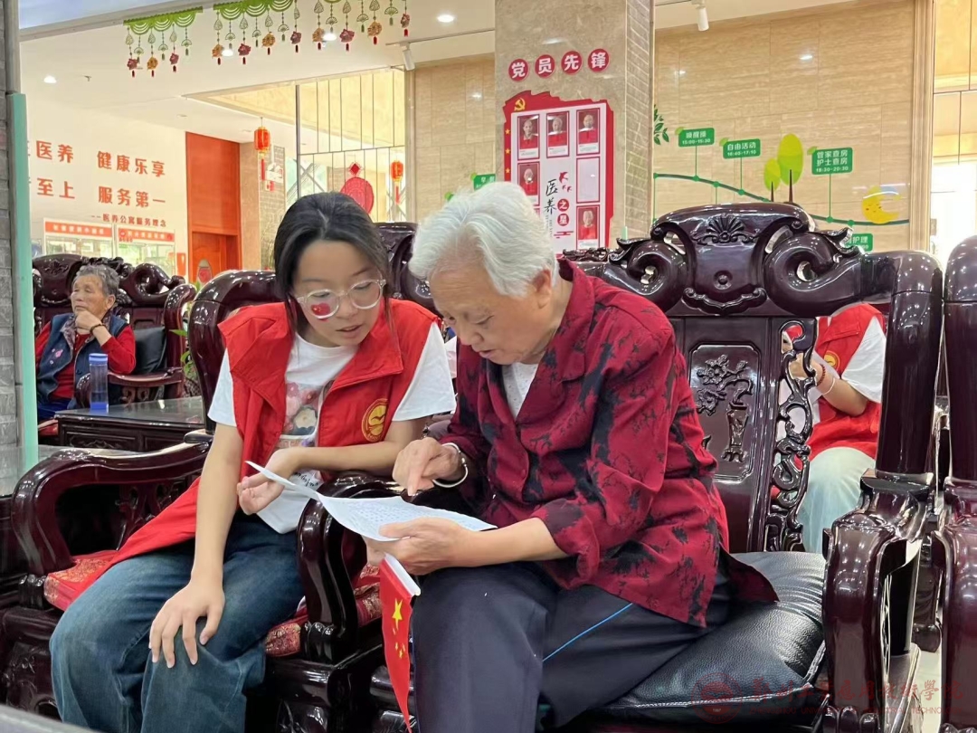 在表演间隙,志愿者们与老人们亲切交谈,询问他们的生活状况和身体情况,倾听他们的故事和心声,老人们也分享了自己年轻时的经历和对祖国的热爱之情。一位老人感慨地说:“看到这么多年轻人关心我们,心里特别温暖。在这个特殊的日子里,我们感受到了祖国的繁荣和大家的关爱。”
