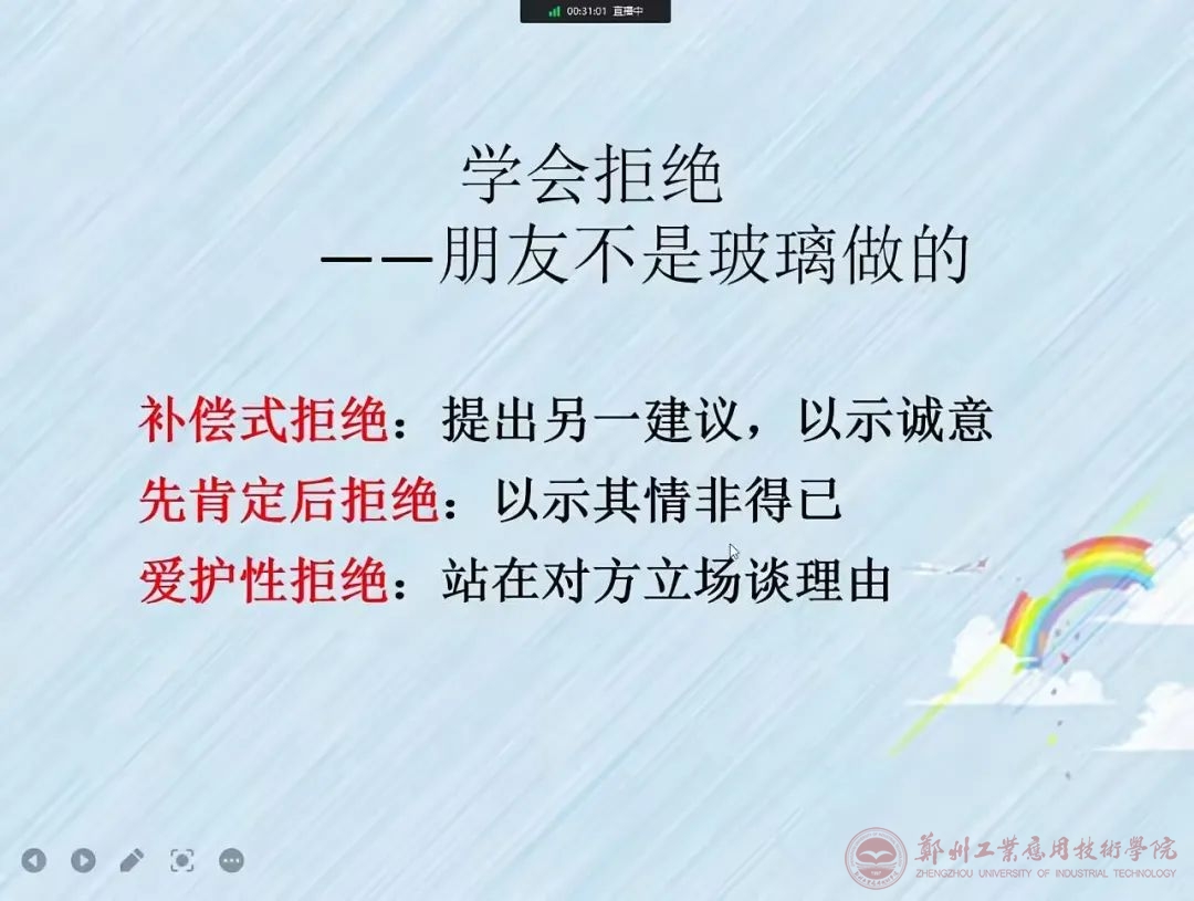 任秋惠老师主要讲解了如何用正确的态度去认真地度过大学四年。她分别从人际关系的处理、如何适应老员工活、自我心态管理、宿舍问题的“七宗罪”、学会拒绝无理要求、财务管理生活费以及自学等多方面进行讲述,同时任老师还建议同学们多读点杂书、天文地理生物、历史经济管理、哲学小说诗歌等各种的书籍。不但可以增长知识,而且也可以获取更好精神滋养,缓解心理压力,不断提升抗压自愈能力。
