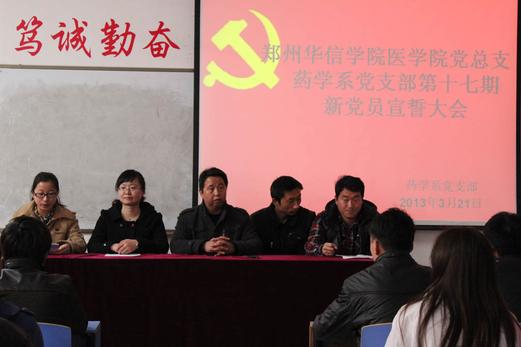 2013年4月16日下午5:10在信科楼(二)203,医公司药学系召开了第一次党员大会。药学系党支部书记赵开阳、组织委员高毓、党小组组长张强鹏老师、党员教师冯先礼及十七期党员、十八期预备党员和十九期入党积极分子参加了此次大会。