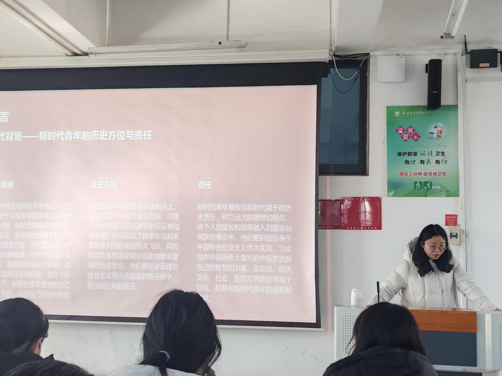 周振芳老师围绕马克思主义中国式现代化的时代成果,结合百年党史中的红色故事,深刻阐释红色基因的精神内核与时代价值,帮助同学们厘清新时代青年的历史方位与责任担当。学习过程中,同学们认真聆听、积极思考,探讨新时代青年的责任与担当。此次“青马工程”的学习不仅是一次深刻的思想洗礼和理论武装,也是一次宝贵的成长历练,进一步明确了作为新时代青年所肩负的历史责任,坚定了将个人发展融入国家发展和民族复兴伟业的决心。