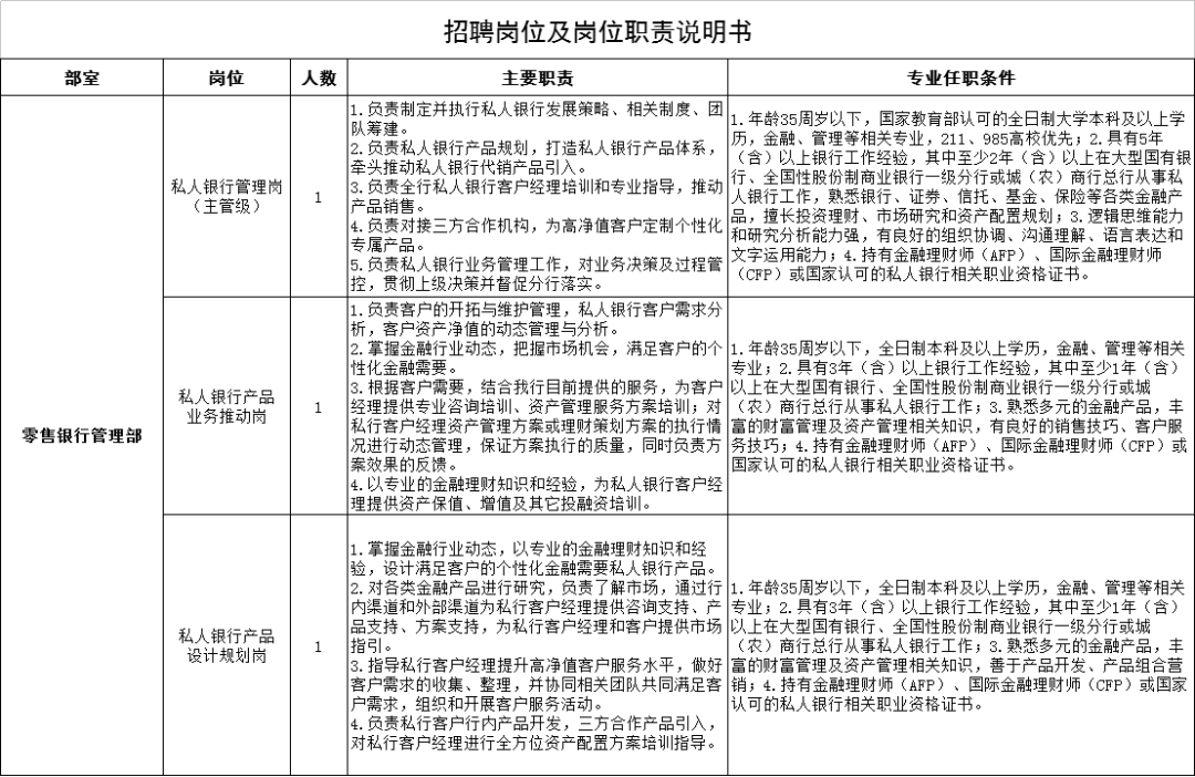 本次招聘岗位为平顶山银行总行零售银行管理部私人银行相关岗位,具体岗位信息及岗位要求详见附件1《点击下表放大查看》。