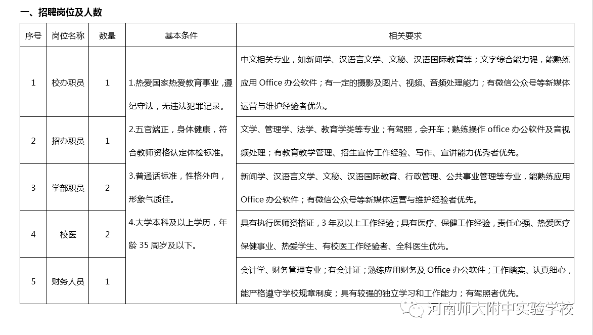 集团一期工程小学至初中九年一贯制校区于2017年9月投入使用,现已拥有小学、初中共65个教学班,全校师生近3500人。根据公司发展建设规划,公司新校区将于2020年8月投入使用,形成小学、初中、高中十二年一贯制的民办教育集团,成为新乡南区优质基础教育资源。现根据公司发展需要,按照公司职员招聘工作规程,面向社会公开招聘。