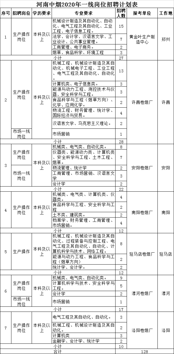 招聘单位、岗位、人数、专业及学历要求见附件《河南中烟2020年一线岗位招聘计划表》(附表1)。