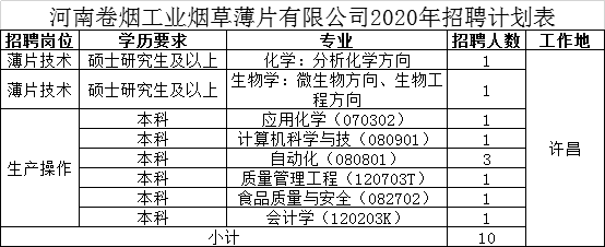 招聘岗位、人数、专业及学历要求见附件《河南卷烟工业烟草薄片有限公司2020年招聘计划表》(附件1)。