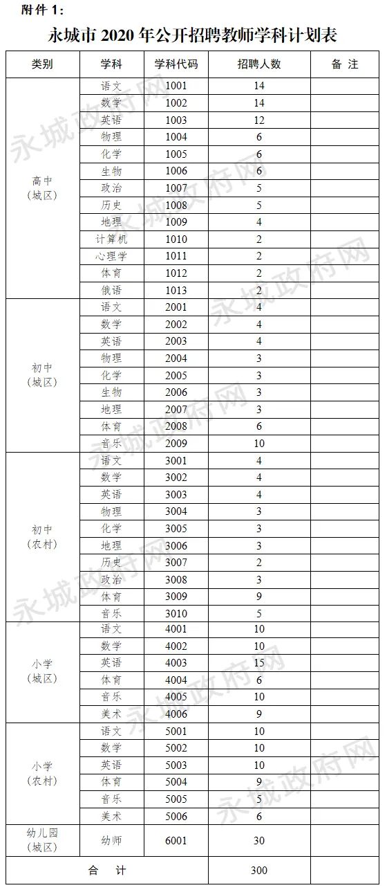 面向2018届、2019届、2020届高校毕业生招聘教师300名。其中:高中教师80名,城区初中教师40名,农村初中教师40名,城区小学教师60名,农村小学教师50名,城区幼儿园教师30名。详见《永城市2020年公开招聘教师学科计划表》(附件1)。