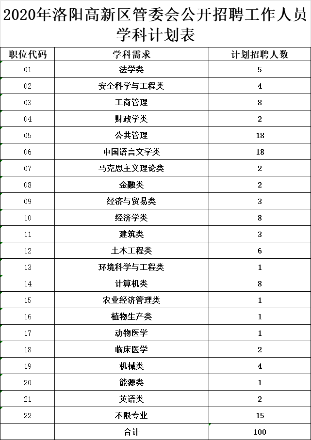 计划公开招聘100人,涉及学科类别21个,另设一个不限学科门类,各学科的招聘数量详见《2020年洛阳高新区管委会公开招聘工作人员学科计划表》(附件1),各学科类别的具体专业要求详见《2020年洛阳高新区管委会公开招聘工作人员考试学科分类专业对照表》(附件2)。