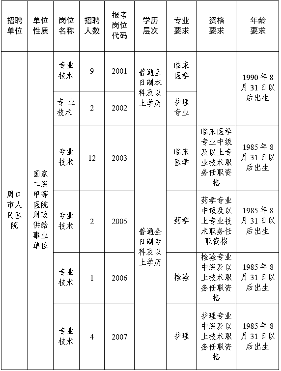 本次招聘专业技术岗位人员30名(资格条件见附件1《周口市人民医院公开招聘专业技术人员岗位计划表》)。