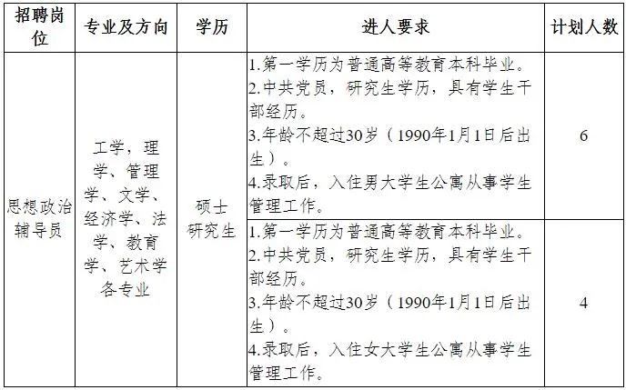 根据公司专业技术人员岗位空缺情况和公司进人计划,招聘10名具有硕士研究生学历辅导员。详见附件《洛阳理工公司2020年公开招聘具有硕士研究生学历辅导员计划一览表》。